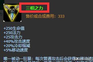 2、三相之力:在赵信的第二件核心装备上推荐选择的是三相之力,赵信没有三相之力在前期的伤害入侵是打不出来的。